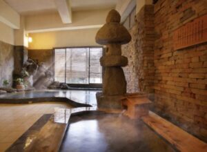 大浴場「出陣風呂」と称される浴場では、石造り・煉瓦の壁・湯殿に灯篭が配され、日本情緒を感じさせる造りとなっています。