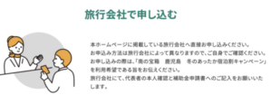 そちらから、電話などで、申し込むことができます。ただし、こちらの参画旅行会社一覧は鹿児島県内に事業所のある旅行会社に限られます。
